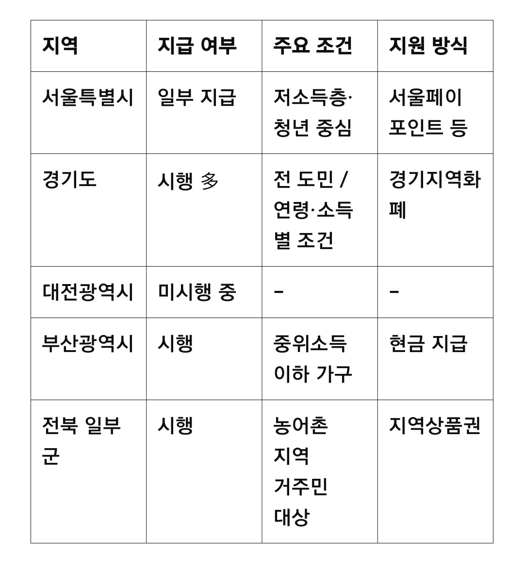 → 지역별로 시행 여부, 지급 시기, 대상 조건, 금액이 모두 다릅니다