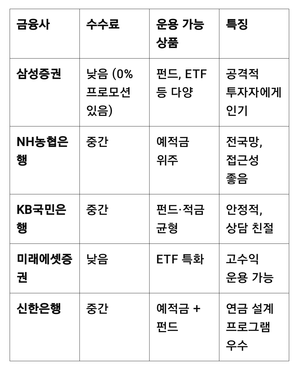 수수료, 상품 다양성, 세액공제 혜택 등을 꼼꼼히 비교해 자신에게 맞는 금융사를 선택하세요.
